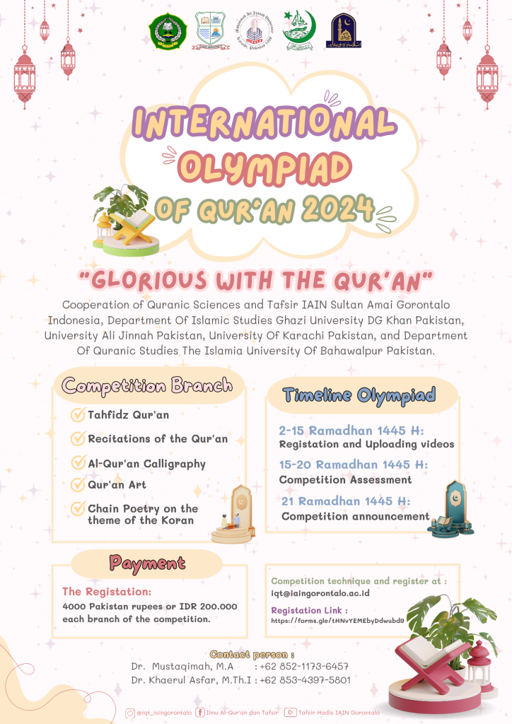 - Arabic/English Quran-themed poetry: Send Quran poetry videos to the committee via IG. Must Follow IG, FB, Like and Subcribe Youtube Al Quran Science and Tafsir IAIN Sultan Amai Gorontalo, Share flyers to 5 whatsapp groups.