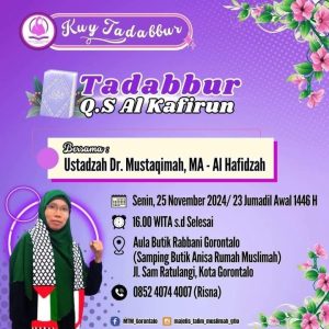 Gorontalo, 25 November 2024 – Kajian spesial bertajuk “Tadabbur Q.S. Al-Kafirun” sukses diselenggarakan berkat kerja sama antara Jurusan Ilmu Al-Qur’an dan Tafsir dan Majelis Ta’lim Muslimah Gorontalo. Acara berlangsung pada Senin, 25 November 2024, pukul 16:00 WITA hingga selesai ini, bertempat di Aula Butik Rabbani Gorontalo, Jalan Samratulangi, Kota Gorontalo.