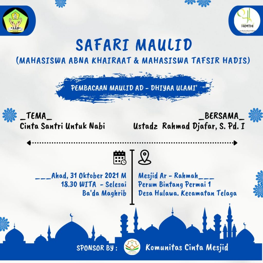 Mahasiswa Tafsir Hadis dan mahasiswa Abna Alkhairaat mengadakan safari maulid pada Ahad 30 Oktober 2021. Safari maulid yang dilaksanakan di masjid Al-Rahmah perum Bintang Permai tersebut dimeriahkan oleh tim hadrah dan diisi dengan tausiah yang dibawakan oleh Ustad Rahmat Djafar S.Pd.I. Safari Maulid yang diberi tema “Cinta Santri Untuk Nabi” tersebut juga dihadiri langsung oleh aparat desa setempat.